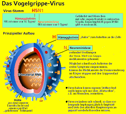 Die Gefahr liegt in einer möglichen Mutation des H5-Virusstammes mit bzw. zu einem menschlichen Grippevirus ;für den es dann aber erst einen neuen Impfschutz geben müsste,die jetzigen Präparate wären unwirksam.Eine vorsorgliche Einnahme von Medikamenten (wie Tamiflu®)bringt nichts im Gegenteil es kann zu Resistenzen kommen und wenn es tatsächlich zu Erkrankungen kommt sind die Mittel wirkungslos.